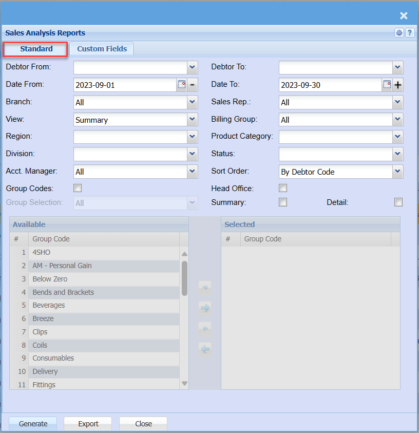 | Head Office | by ticking the box, the report will include head office sales analysis |
