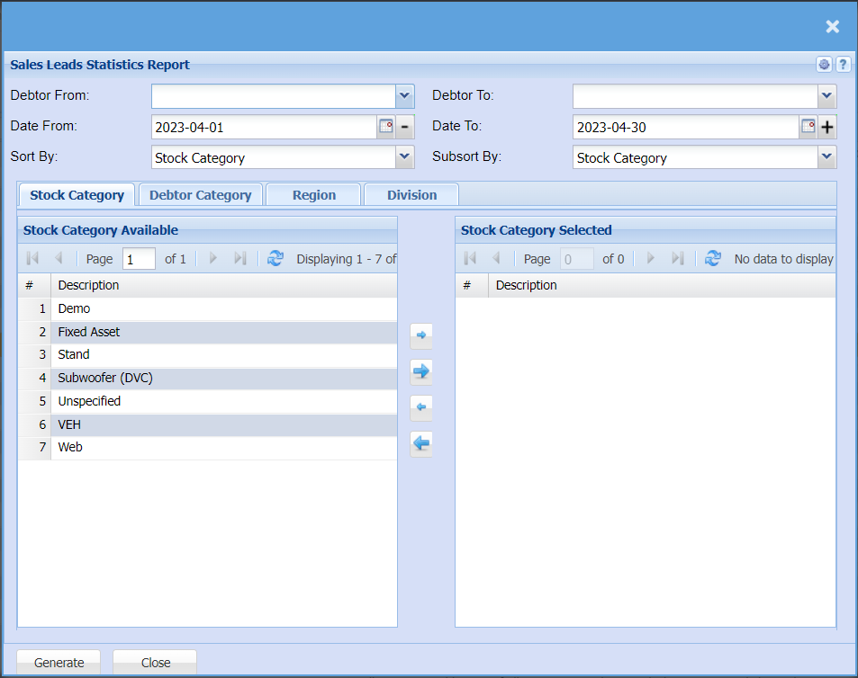 | Stock Category | In the Stock Category Tab, you will see a list of Stock Categories that you can pull the report for, by double click on the stock category or categories you would like to pull the report for will put them over to the selected column. |