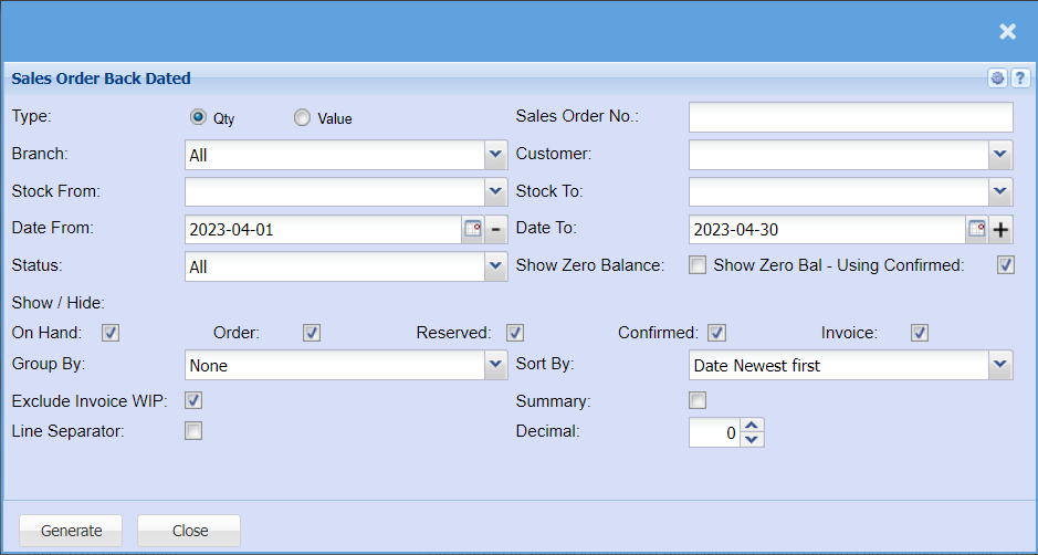 | Show Zero Balance | By ticking the box, the sales order back dated report will include zero balance |