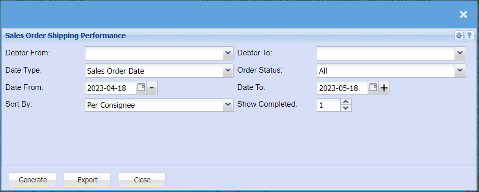 | Sort By | Select from the drop-down menu if you would like your report to be sorted by, Per consignee, Shipment Required at Customer or Sales order No. |