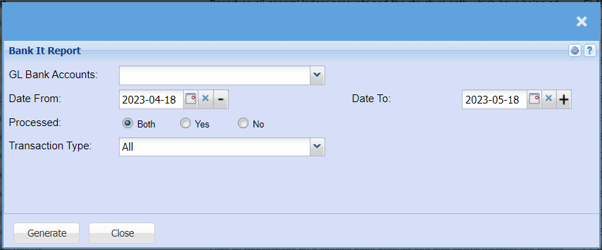 | GL Bank Accounts | Choose the account you want to run the report for. |
