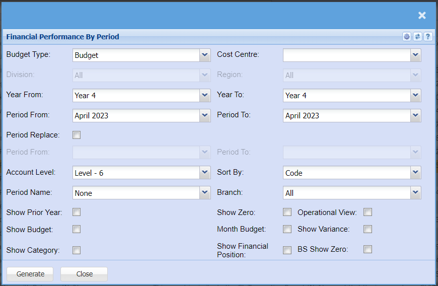 | Period From | Select the period from that you want budgets to replace actuals |