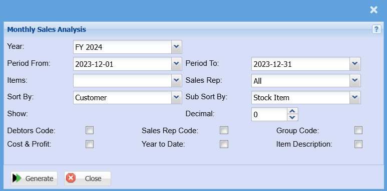 | Year to Date | Put the tick on for the report to display year to date in a separate column |