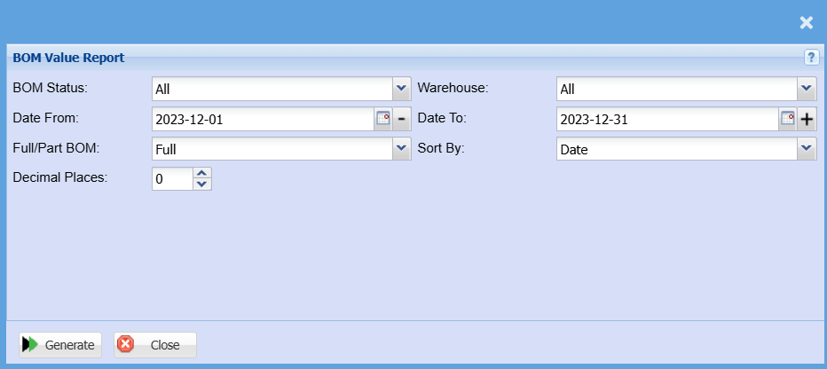 Leave a report criteria on all to search for all BOM statuses If you wish to view a report by a specific BOM status, select the BOM status from drop down selection |