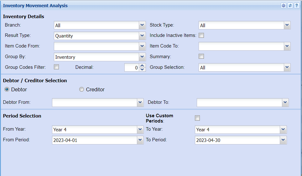 Inventory Analysis of movement per financial period grouped by Inventory Items or by Debtor or Creditor