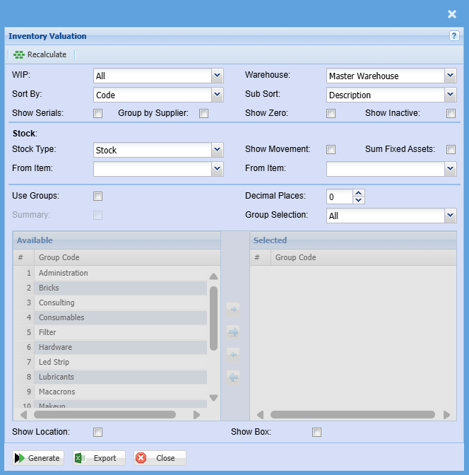 Gives a report of all items cost, multiplied by quantity, to give the total value of stock. This can be given by warehouse, group codes and by various Work in Progress areas.