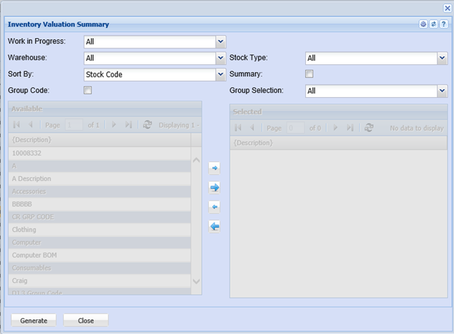To run the report, select work in progress, warehouse, stock type and sort by options from the drop down arrows.