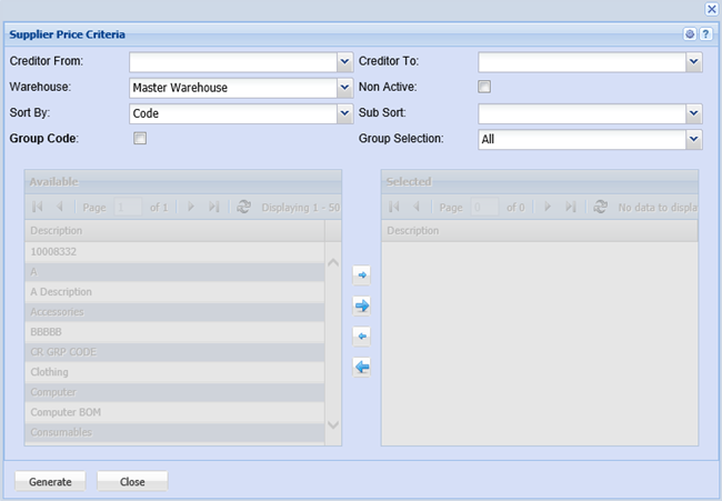 Shows each item with its supplier code, last update and supplier cost in a list.