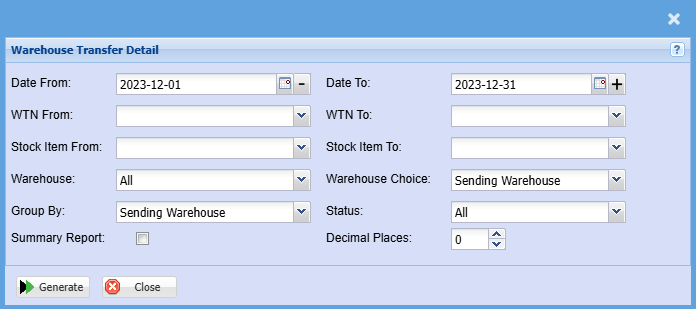 | Warehouse Choice | Select either sending warehouse or receiving warehouse for the report |