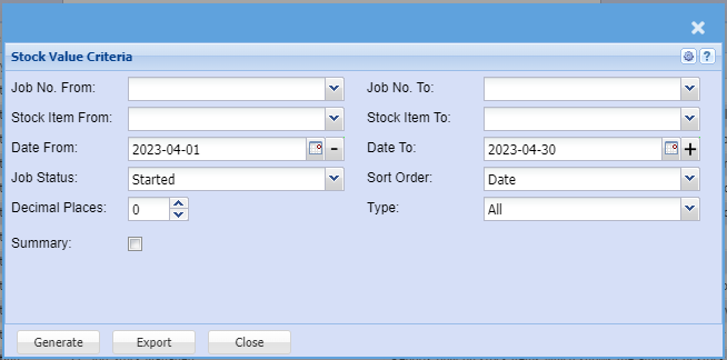 Shows all stock items that have being managed on jobs between specified dates. It will give the quantity multiplied by the cost to give the total value that is currently being managed on Jobs.