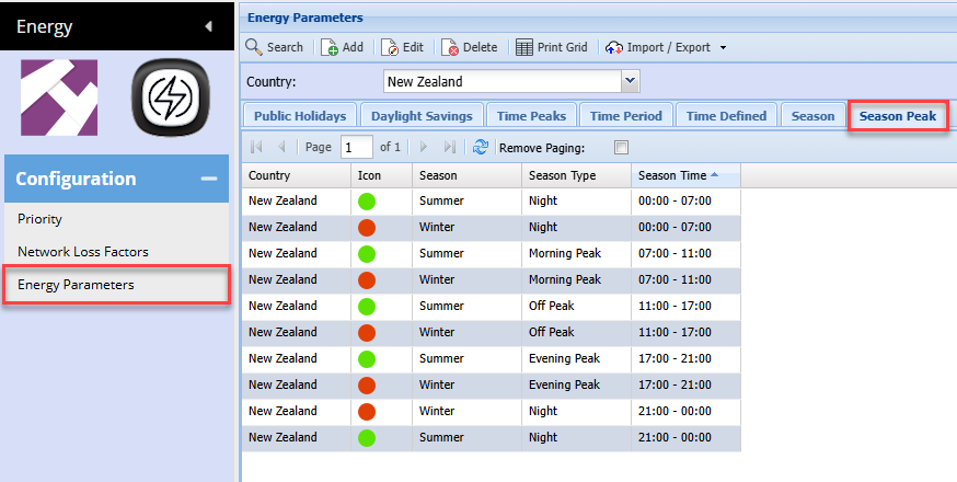Energy Parameters Season Peak