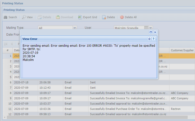 Should there be an error on the sending out of the email, highlight that error and click on view to see the details .