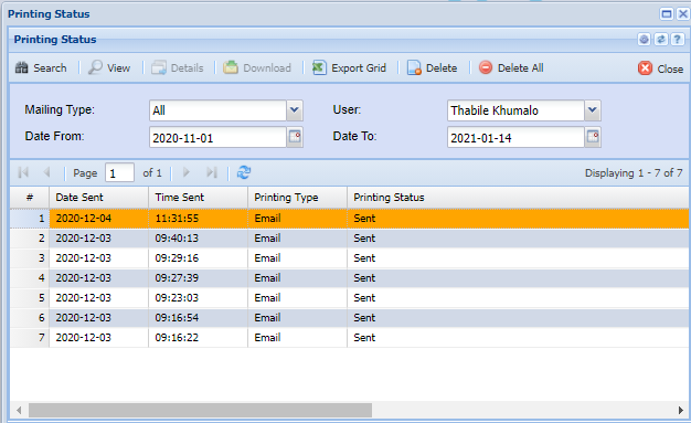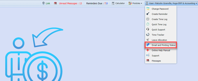 To check the status of the emails sent, click on your username on the top right hand corner of the module and select printing status.