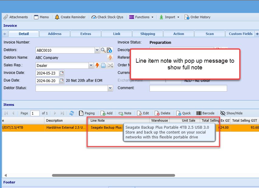 Line item note on the document grid with hover over allows users to see additional information about a specific line item without having to click on it