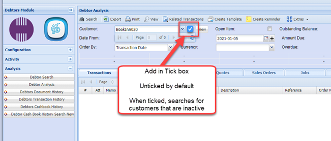 When selecting a debtor/customer, creditor/supplier, or any of the mentioned documents, the drop-down menu will only show inactive customers, suppliers, inventory item codes, or GL analysis
