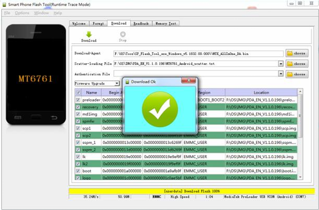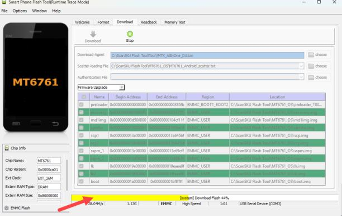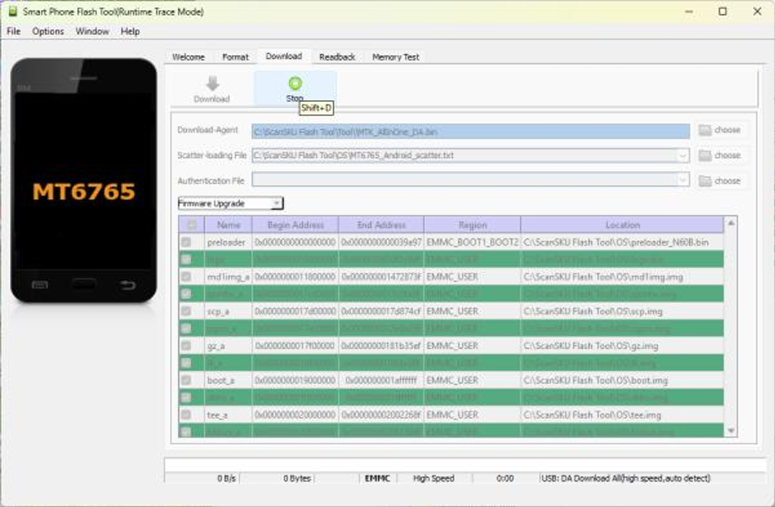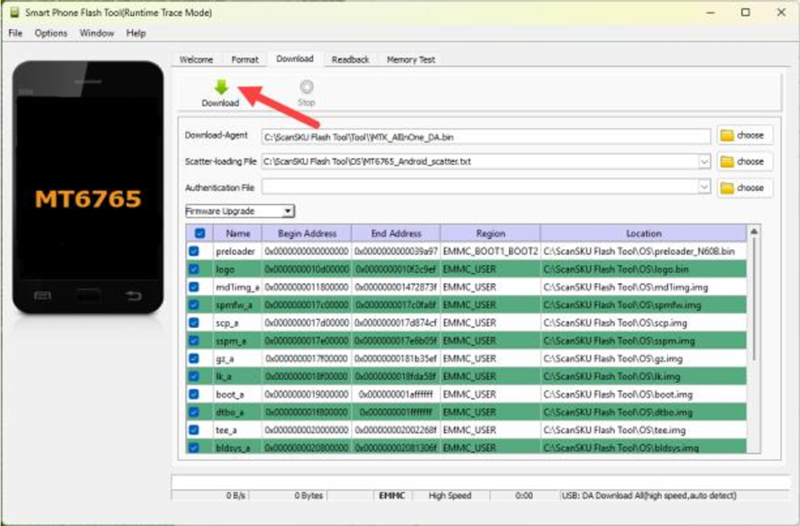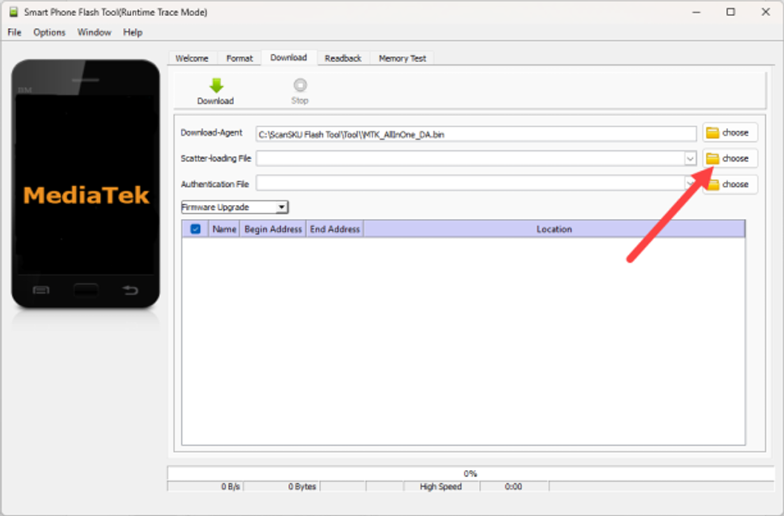 3. The first time the Flash Tool opens, the “Scatter-loading File” is blank. Select Choose, search in the “OS” directory and select the “MT6765_Android_scatter.txt” file.