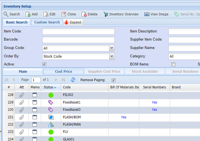 When searching in the inventory setup, the grid will display items with icons