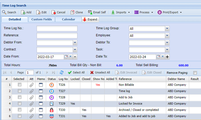 When searching in the Time logs, the grid will display items with icons