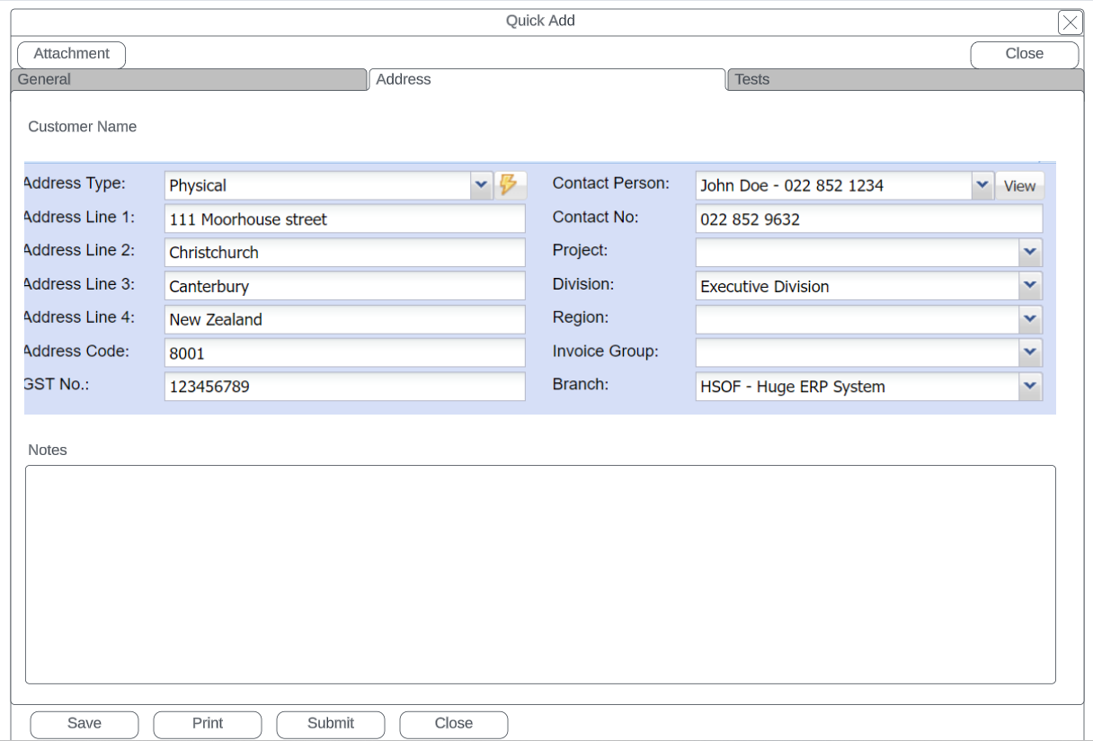 Select the address type (will populate from customer setup) Physical, Postal, Delivery Address |