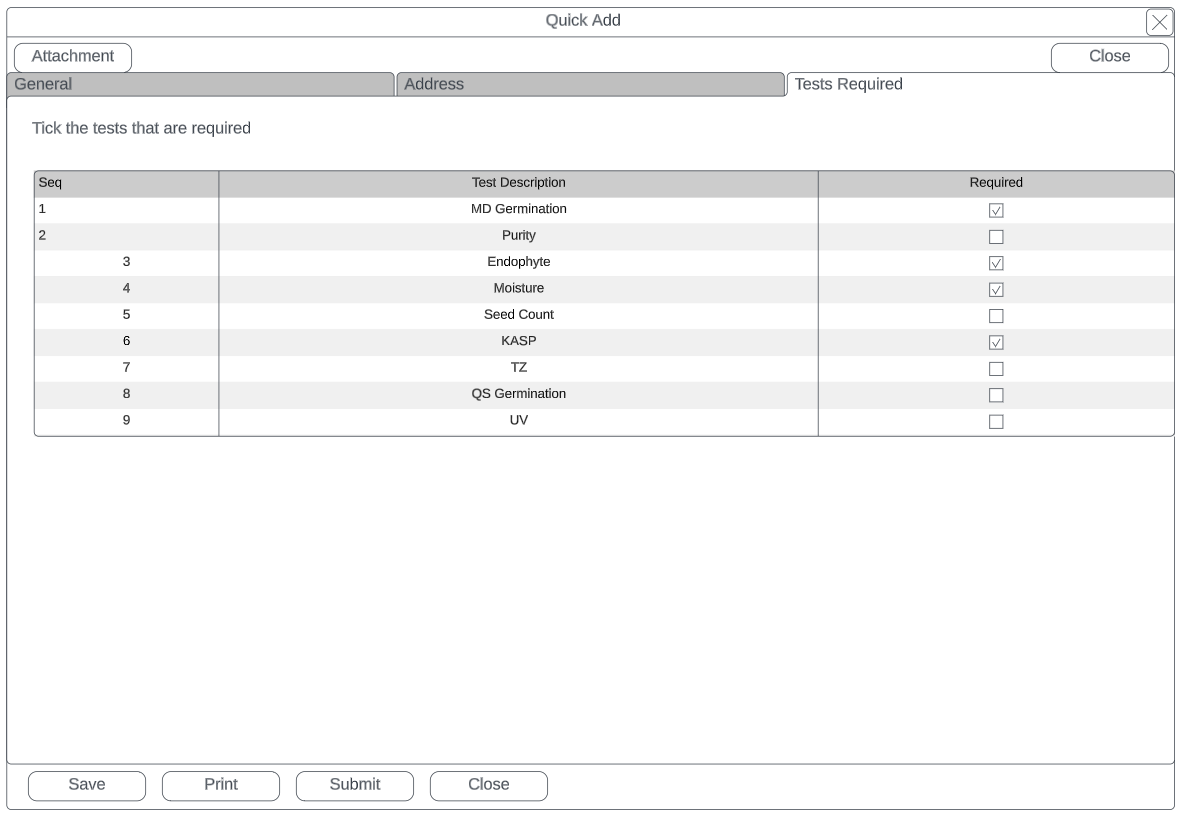 | Grid of listed tests | Tick the tests required |