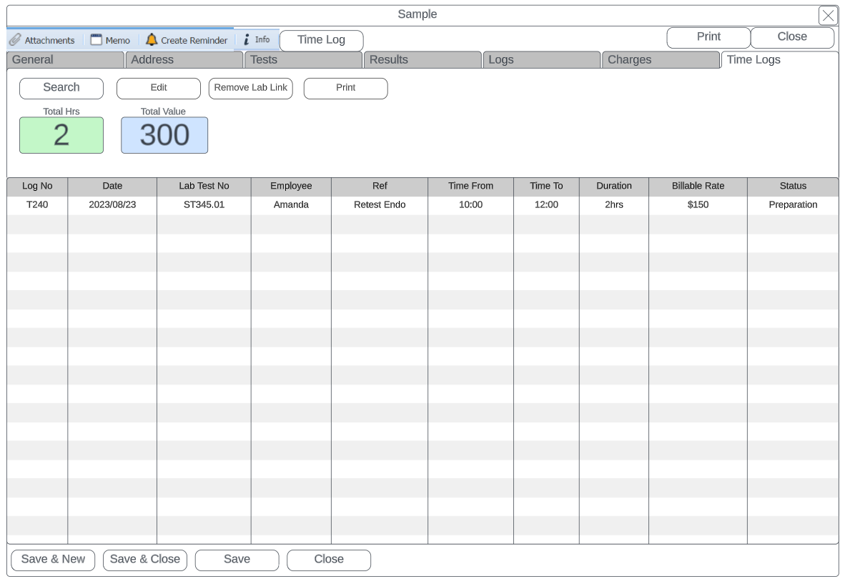 | Lab Test No | Shows the Lab test number that the time log is linked to |