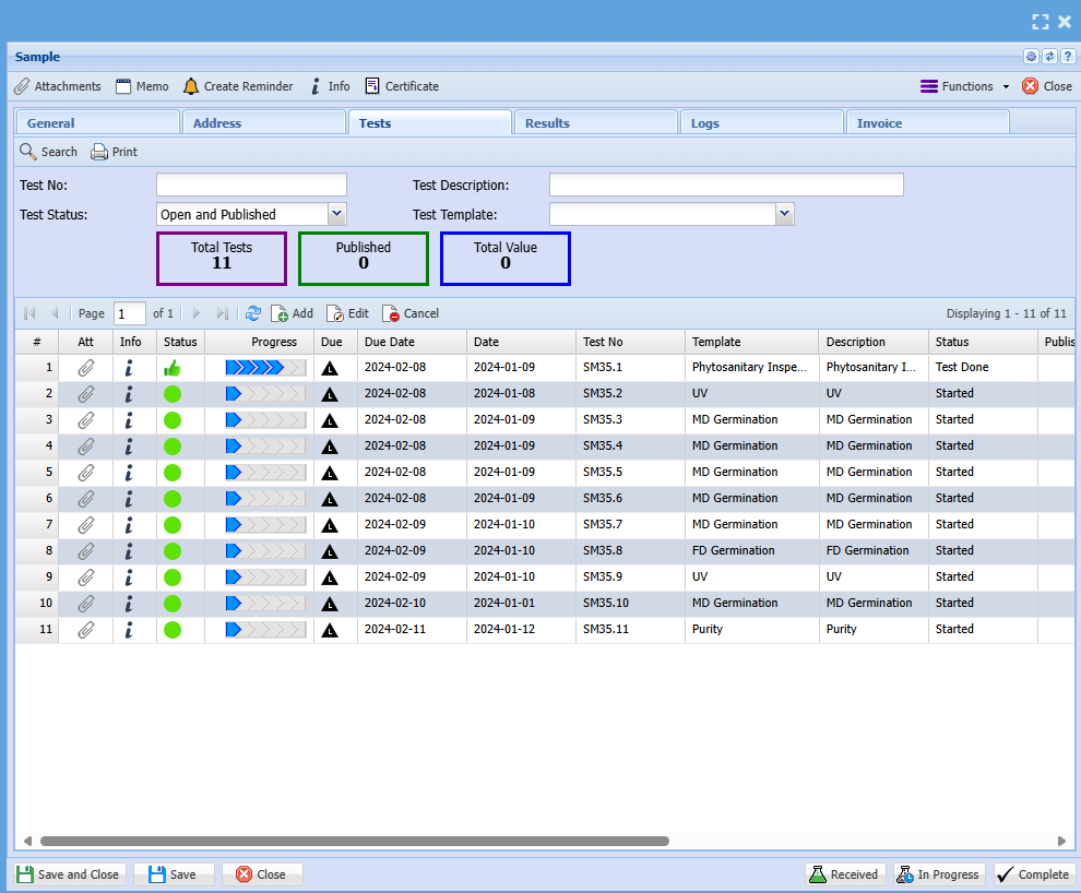 Filter status of tests Created (Gray), In progress (Green), Signed Off (Blue), Completed (Certificate Issued)(Blue), Cancelled (Red), Closed (Red) |