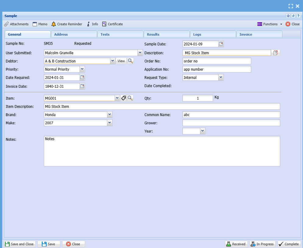 | Date Required By | Date the test is required, will default to 14 dates from issue |