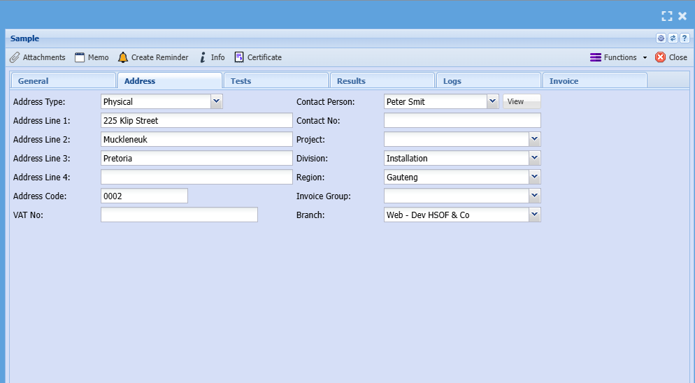 Select the address type (will populate from customer setup) Physical, Postal, Delivery Address |