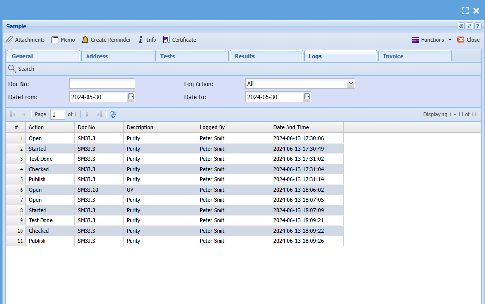 Type of action logged Status change of Lab test, Status change on tests, Authorised By, Percentage update on tests, Publish notice, invoice created |
