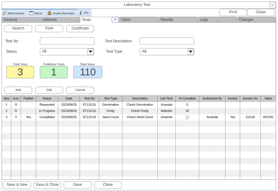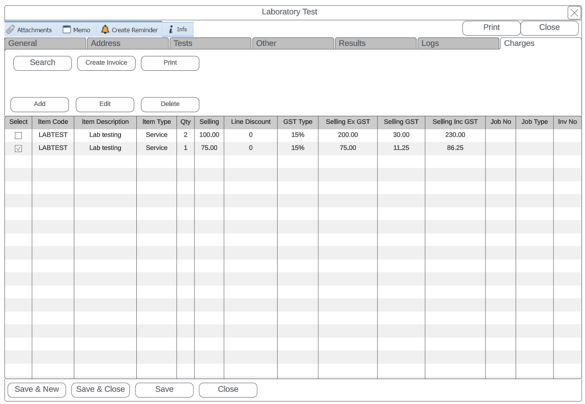 For each test that is done, a tick can be put on for charging which creates an entry for list of items to be invoiced