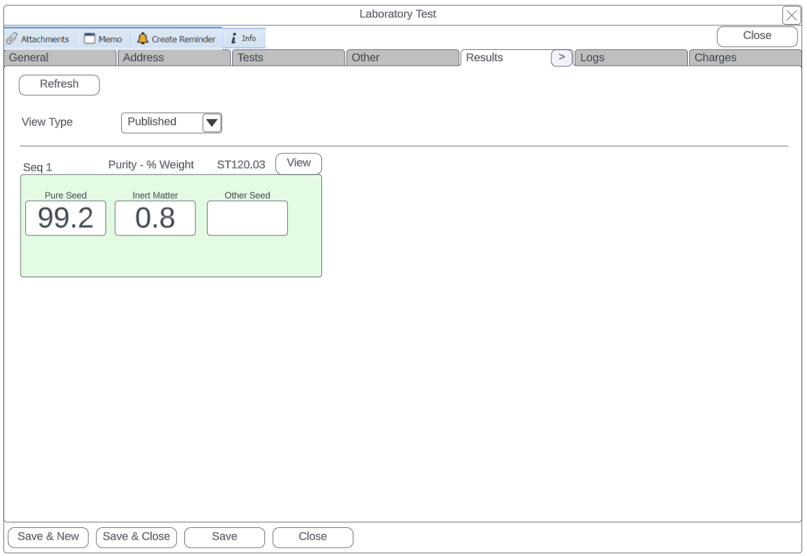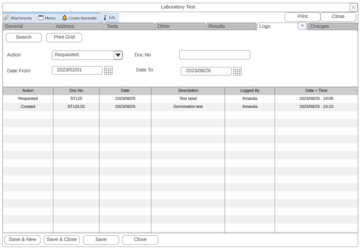 Logs Displays all the logs and actions that have occurred on the lab test