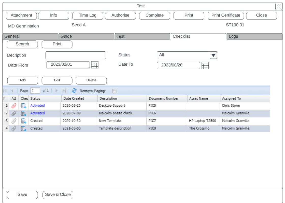 | Checklist | Viewing multiple checklists against a test |