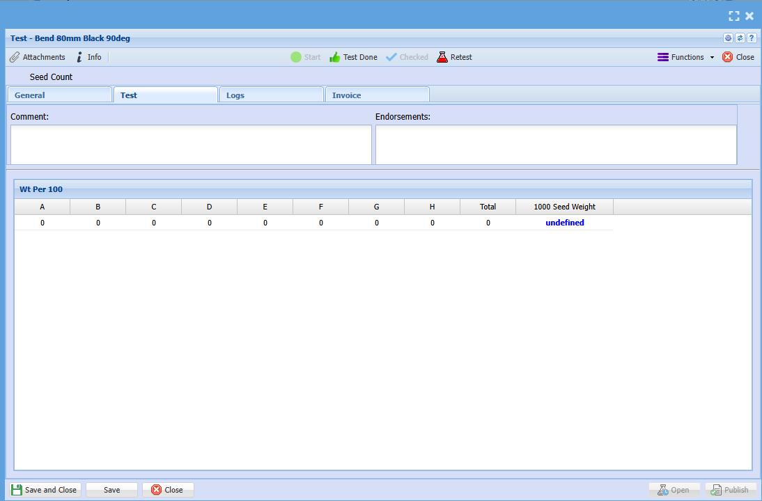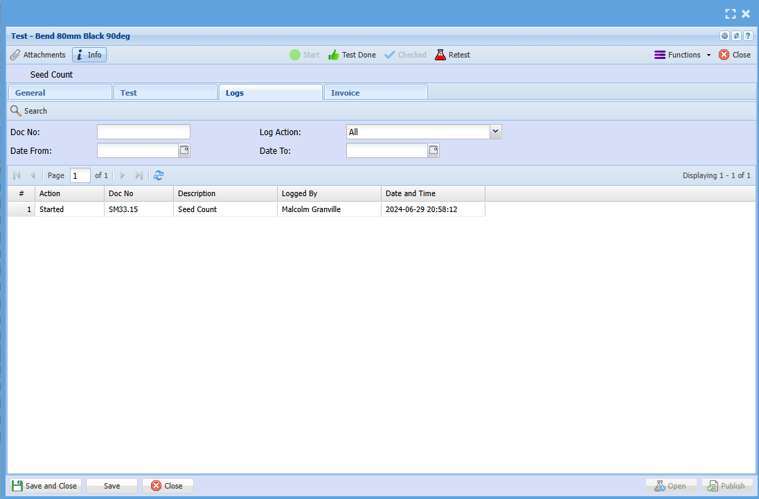 Shows the logs for this test Status change, % Complete change, Checked by, Retest by, Invoice By, Certificate Issue, Published by |