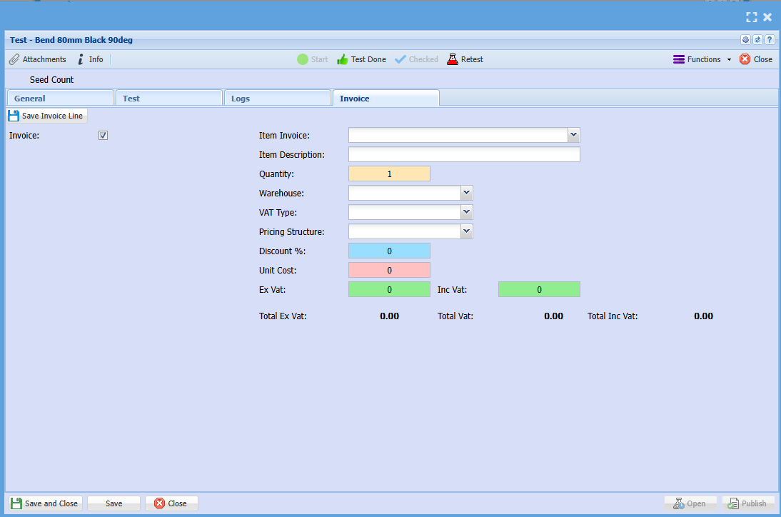 Item code becomes active when invoice tick box is activated This item will be added to the Lab test chargers window |