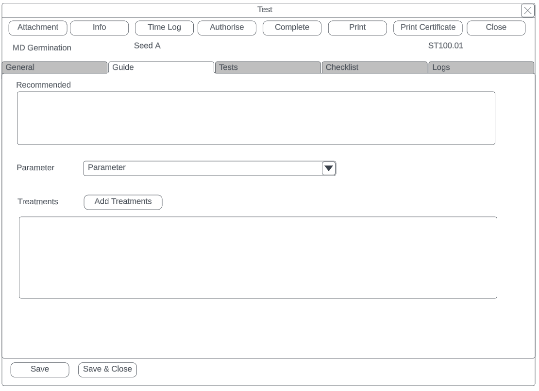 | Guide Tab | Shows Parameters, Treatments for test |