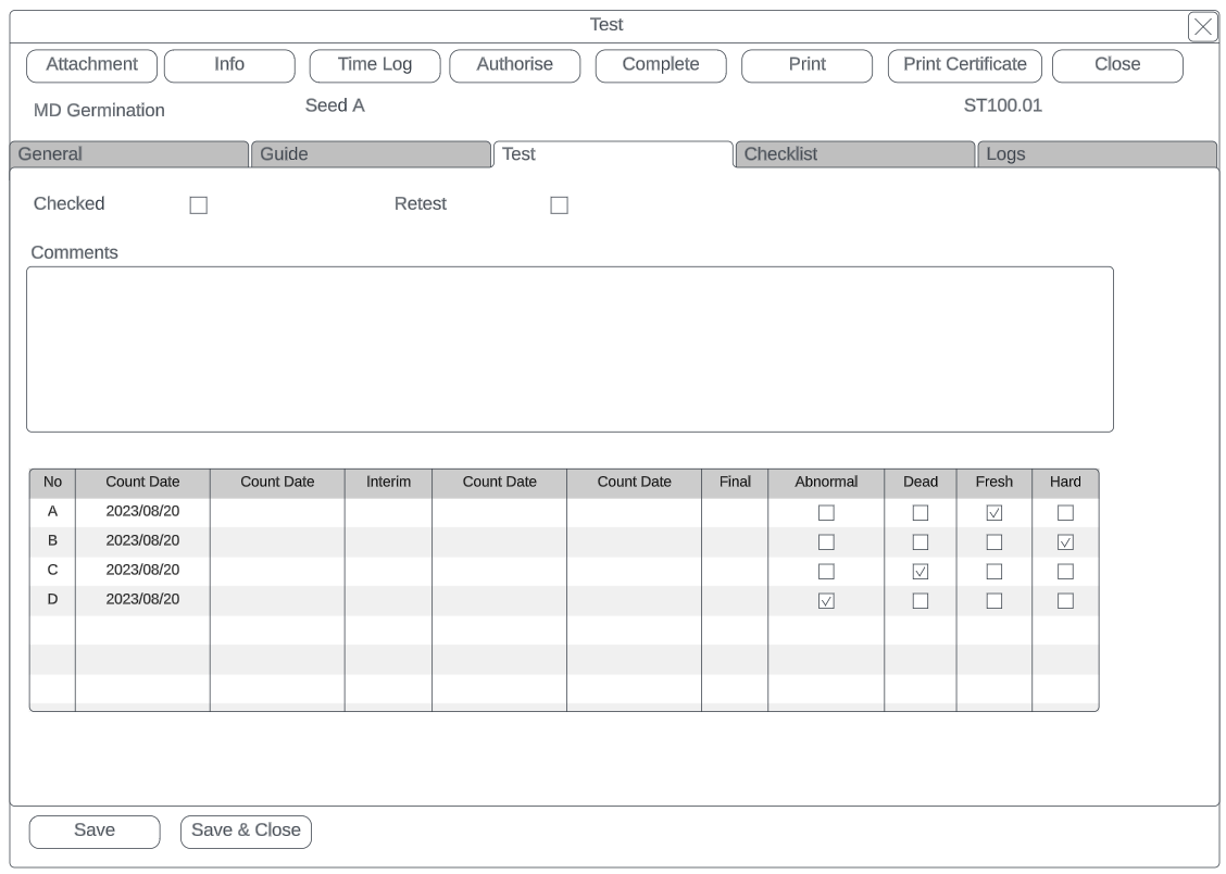 | Retest | Retest tick box with Retested by |