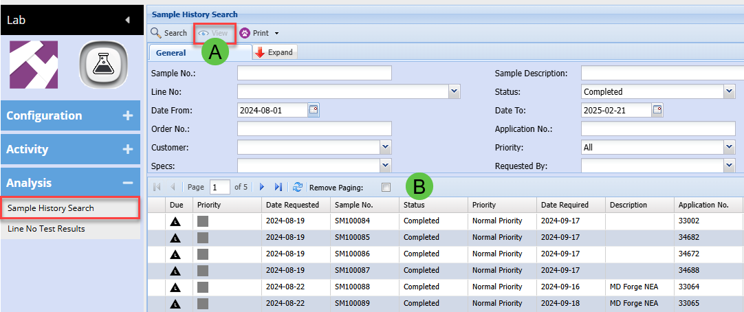 Lab Module > Analysis > Sample History Search