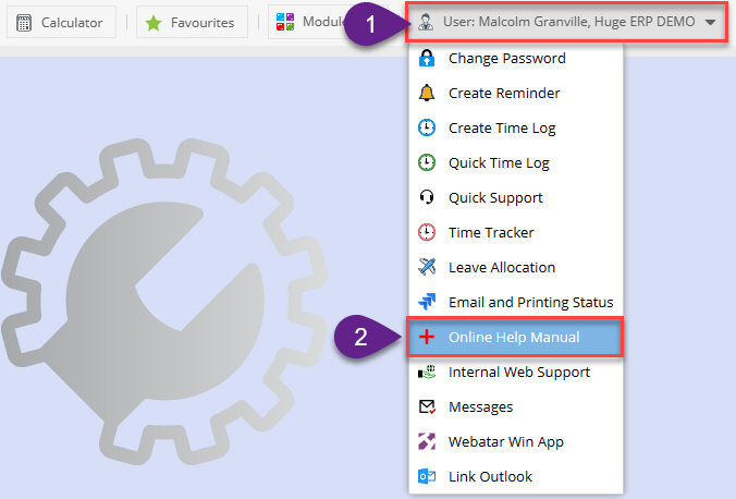 After logging into the system and going into any one of the modules. Click on your user on the top right-hand corner of the window to view the drop down. Click on Online Help Manual