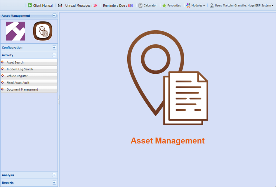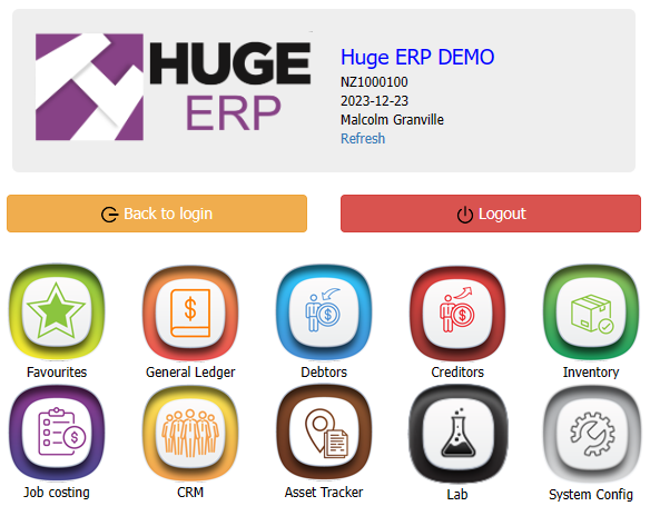 After gaining access to your company account you will be presented with the Huge ERP and Asset Management landing page.