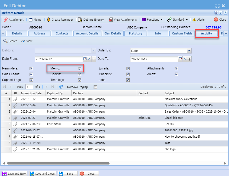 Under the Activity tab, you can view all activities and actions against the debtor