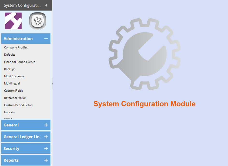 The System Configuration Module is the central module for most of the system setup and configuration. This was designed to ensure most of the configurations are in one module allowing the restriction of this module to users.