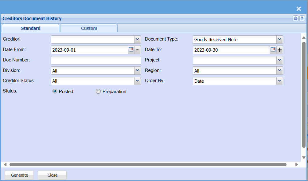 Gives a full report on Creditors Documents which have been posted. Report is filtered by Document type and date.