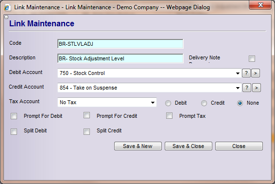 Now the Stock level has been adjusted to match our example given at the beginning. Now change the Stock Adjustment Level GL link Credit account back to Cost Stock Adjustment by going to Configuration >General Ledger Links >GL setup >Stock Level Adjustment >Amend >select Cost Stock Adjustment for Credit account.