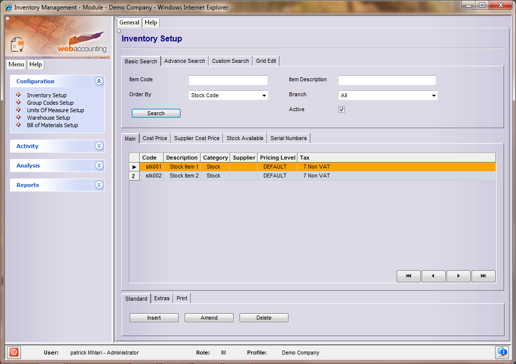 Based on the example above, create the two inventory items. Stock items can be imported from an excel spreadsheet or created individually. Inventory>Configuration>Inventory Setup >Insert. Once the two items on the example are created your inventory setup screen should look like this: