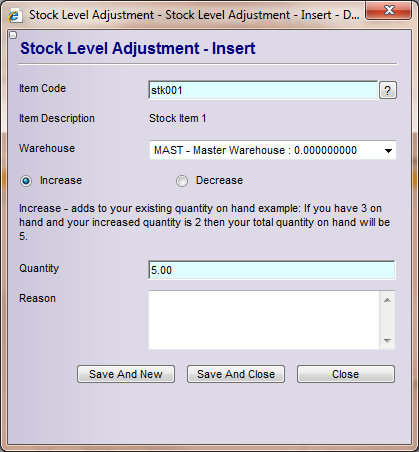 Do a stock level adjustment to get your stock to agree with details stipulated on the example above. To do this you have to go to Inventory >Activity >Stock Level Adjustment >Insert