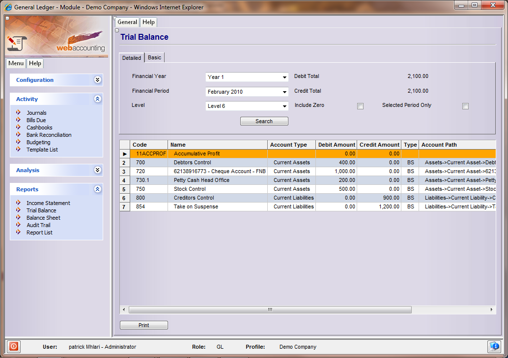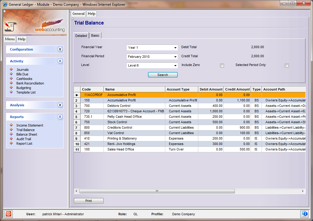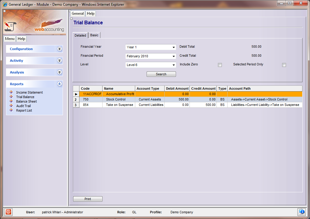 To verify that the stock level was successfully done go to the Ledger Module >Reports >Trial Balance >Search. Your Trial Balance should look like this: