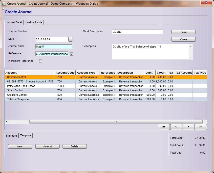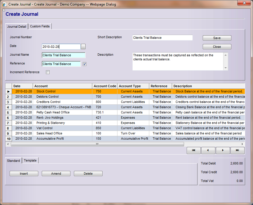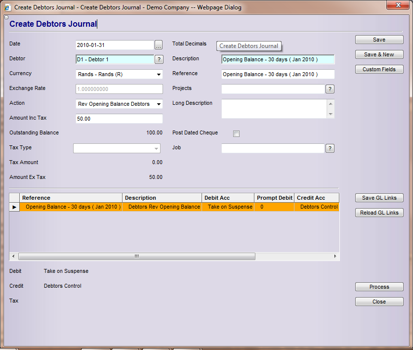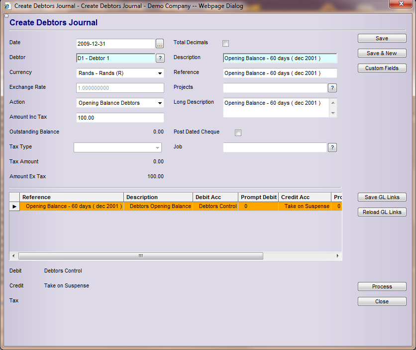 Now create debtors journals to make the Debtors match the given example. To Create a debtors journal, select the Debtors module >Activity >Debtors journal >Insert >Save & Close >Process. To create a 60 days balance you have to back date 60 days on your journal, in this case you back date to the 31st of December 2009.