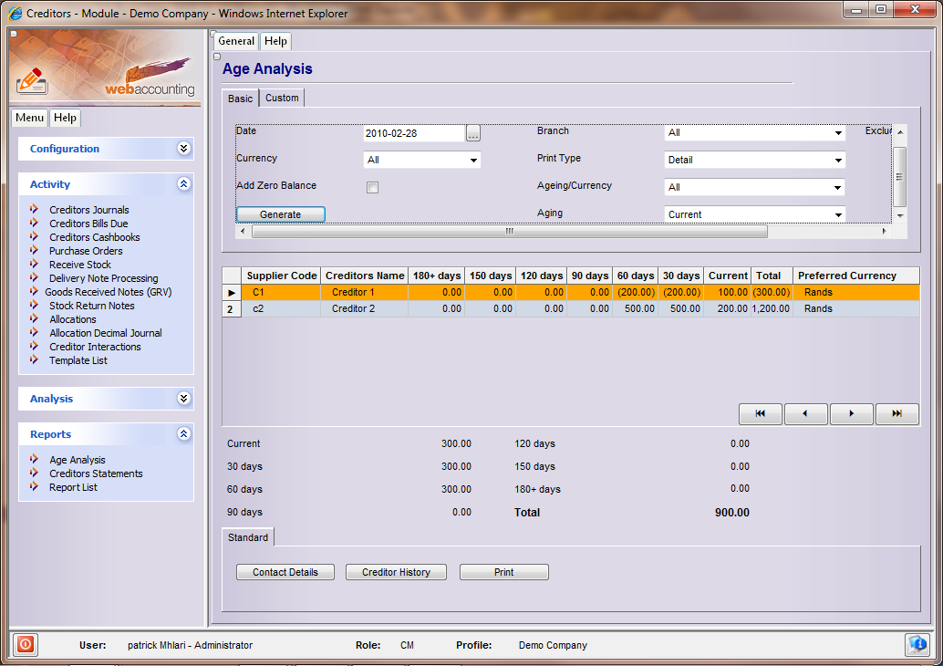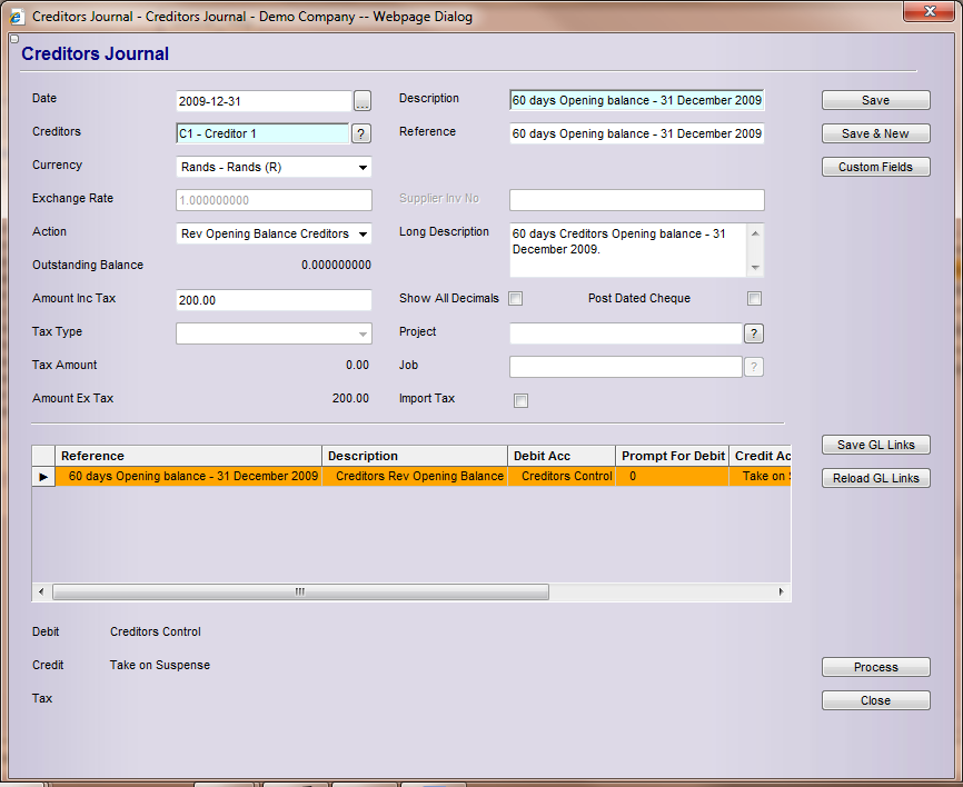 2b) Creditors Module >Configuration >Creditors Setup >Insert Creditor >Save >Close. Create creditors journals to match information on the example. To create a Creditors Journal you go to the creditors module >Activity >Creditors Journals >Insert >Save >Process.