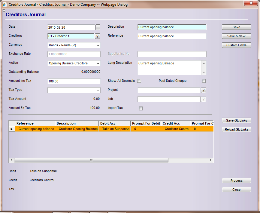 This should be your very first entry if the company you are setting up works with stock. First change the Credit account of the Stock Adjustment Level GL link from Cost Stock Adjustment to Take On Suspense. To do this you would follow these steps: