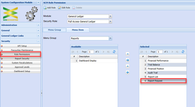 To view the report request menu item, go to system configuration>security>roll permissions.